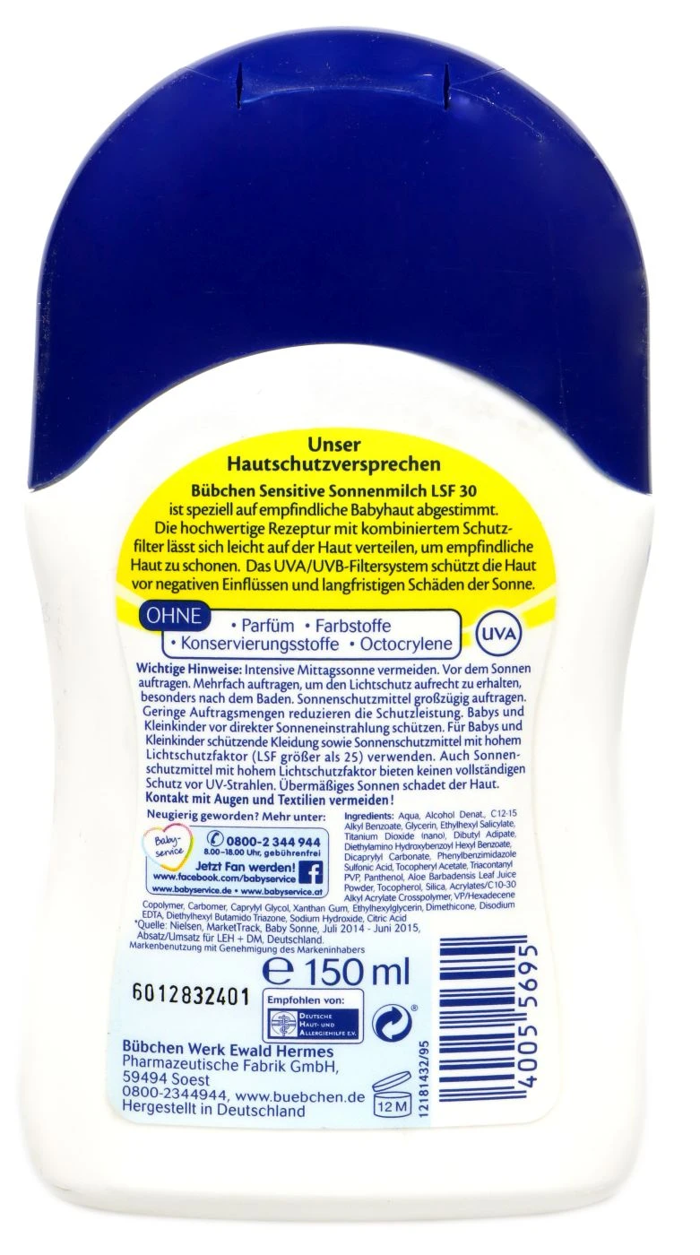 Bübchen Sensitive Sonnenmilch mit Lichtschutzfaktor 30 ist ein zuverlässiger Sonnenschutz für Babys. Die Sonnenmilch lässt sich gut auf der Haut verteilen und schont sie vor negativen Einflüssen. Auch empfindliche Haut ist gut geschützt und wird vor Sonnenbrandgefahr bewahrt.