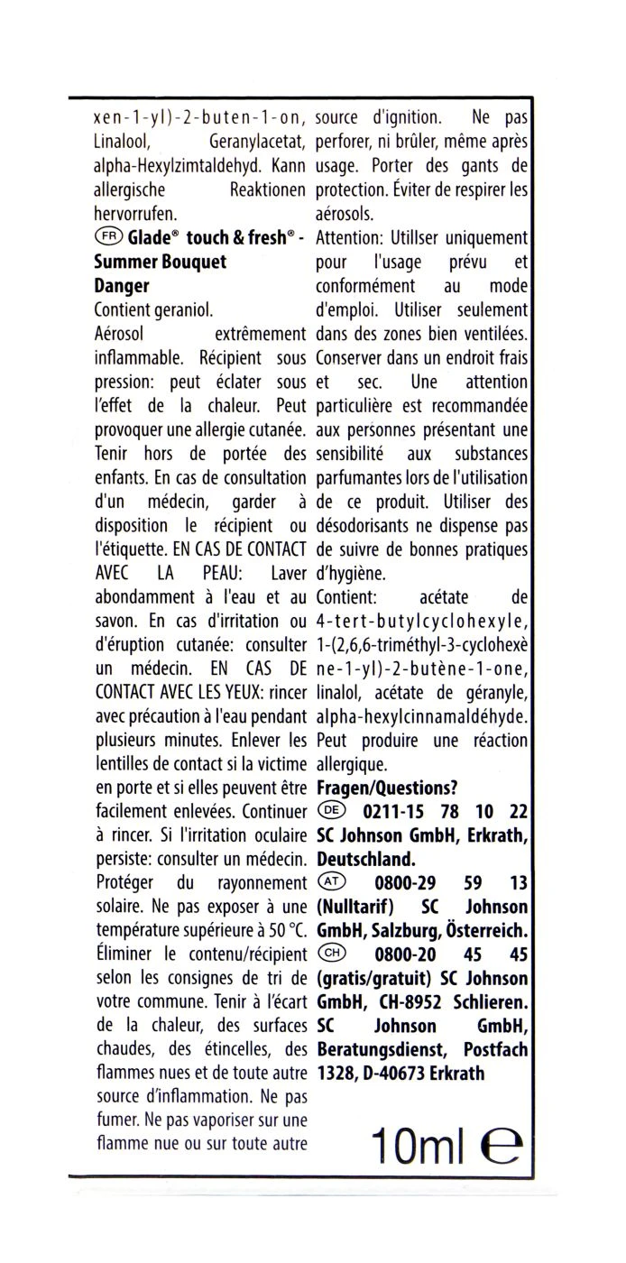 Glade by Brise One Touch Summer Bouquet ist ein Nachfüllduft für Duftstationen. Der Raumduft gibt Räumen einen sommerlichen Blumenduft und unterbindet so strenge und unangenehme Gerüche.