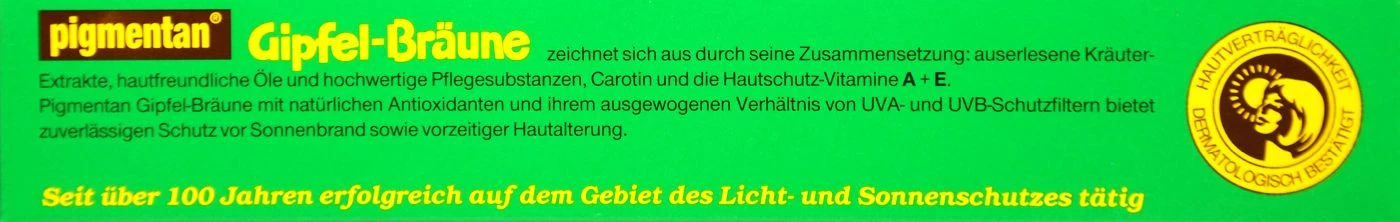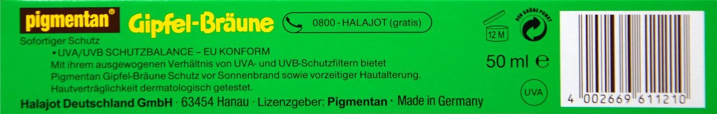 Pigmentan Gipfel-Bräune ist ein tiefbräunender Sonnenschutz mit einem Lichtschutzfaktor von 8. Durch die Gipfel-Bräune erhält die Haut sofortigen Sonnenschutz, indem sie ein ausgewogenes Verhältnis von UVA- und UVB-Schutzfiltern bietet. Zusätzlich wird die Haut vor Sonnenbrand und vorzeitige Hautalterung bewahrt. Das Ergebnis ist eine schöne ebenmäßige Hautbräune.