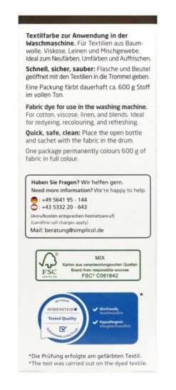 Simplicol Intensiv Mint-Petrol, 1027251, ist eine Textilfarbe zur Anwendung in der Waschmaschine. Ideal für Textilien aus Baumwolle, Viskose, Leinen, sowie Mischgewebe. Nicht geeignet für Synthetics, Wolle und Seide.